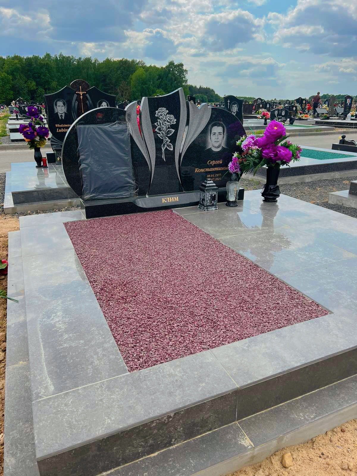 Двойные памятники, как это понятно из названия, предназначены для двойных захоронений. Это общее, однако далеко не обязательное правило. Нередко наши клиенты заказывают горизонтальные памятники на троих, а также на одиночные захоронения. Горизонтальные памятники представляют собой конструкцию из основания — тумбы, установленной не нее горизонтально гранитной плиты и фронтального элемента – цветника или надгробной плиты.